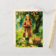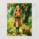 Postal con un retrato de acuarela de un joven chica vestido de rojo parado en un huerto, sosteniendo una canasta de manzanas. A su alrededor hay manzanas maduras en el suelo y colgadas de los árboles. La escena evoca calidez, inocencia y la belleza de la naturaleza.
