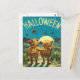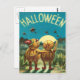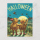 Debe ser Halloween porque las brujas están volando y las criaturas están mirando. Esta imagen vintage de Halloween incluye monstruos de calabaza viendo a las brujas volar en sus escobas. Luna llena iluminando el cielo de fondo.
