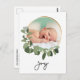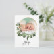 Diseño de tarjetas para Navidades minimalistas con una moderna letra para "Alegría" El bonito anillo dorado está delicadamente decorado con hojas verdes y flores blancas. Personaliza los nombres, saludos, dirección y foto (bebé, familia, niños) con tu propia foto.