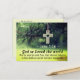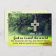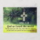La postal inspiradora representa una cruz con un corazón colgando de una rama de pino y presenta la Biblia Verso Juan 3:16, "Dios amó tanto al mundo que dio a su único Hijo, que quien crea en él no perecerá sino tendrá vida eterna".