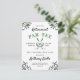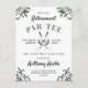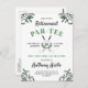 Cartel de invitación a la fiesta de retiro con temática de golf en blanco y verde con vegetación, y una pelota de golf y clubes de golf cruzados.