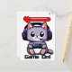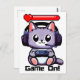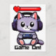 Gatito jugador adorable sosteniendo un controlador de consola con un auricular, con una barra de estado y texto (¡Juego!).