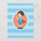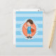 Este diseño presenta un adorable jugador de baloncesto de pelo castaño con uniforme azul, pelota de baloncesto naranja y fondo azul.