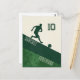 Esta postal de alto personalizable contiene la silueta de un futbolista que pasa la pelota. El diseño se compone de dos tonos verdes que representan el campo de fútbol y el color beige. Puede personalizar el número de la camiseta, el nombre del jugador y la posición del jugador.
