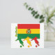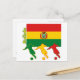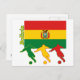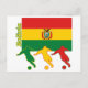 Tres futbolistas bolivianos en silueta juegan frente a la bandera boliviana. El nombre del país Bolivia está de lado.