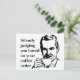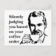 Divertido eslogan "Juzgarte silenciosamente basado en tu pedido de café" con un sofisticado tipo crítico bebiendo su bebida.