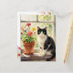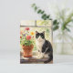 An illustration of a black and white cat sitting on a flower filled window sill. A beautiful postcard to say hi and keep in touch with friends or family.