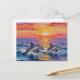A pretty postcard with two dolphins swimming across the ocean waves at sunset done with ai in an impasto oil or acrylic style.