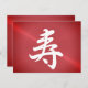 Tarjeta postal con Kanji felicitaciones - 寿 - un símbolo kanji popular que significa en japonés larga vida y felicitaciones. Diseño de texto de Alma Wad en fondo de aspecto metálico rojo bruñido. Puedes personalizar esta tarjeta ahora con tus propias palabras. Japonés o inglés.