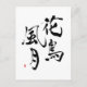 Estos caracteres kanji se pronuncian 'ka cho fu getsu' y se refieren a la belleza del mundo natural y expresan una reverencia y una profunda apreciación por la naturaleza. También se utilizan para describir obras de arte como poesía y cuadros que representan a la naturaleza con sensibilidad, elegancia y refinamiento. Inherente es la noción de que en el proceso de tomarnos el tiempo para ver realmente el mundo natural que nos rodea, se nos da la oportunidad de entendernos más plenamente también. Los cuatro personajes que componen esta expresión fueron escogidos hace mucho tiempo para representar esos sentimientos porque son elementos del mundo natural que se han celebrado por miles de años: Flores (花 ka), Aves (鳥 cho), Viento (風 fu) y Luna(月 getsu). Los personajes están escritos de manera tradicional, verticalmente de derecha a izquierda. Compuestos kanji de cuatro caracteres como este se conocen como yoji jukugo (四 字 語). Hay cientos, y se les exige estudiar para los niños japoneses. Aparecen en los exámenes de ingreso a la escuela, así como en la conversación de personas bien leídas. Son gemas lingüísticas que transmiten significado de manera compacta, colorida y profunda. A menudo están infundidos con referencias a cosas como la literatura e historia clásica china y japonesa y preceptos budistas. La artista de pincel Sanae creó este trabajo a mano en su estudio en Kioto. Luego lo escaneamos para usarlo aquí. El sello de nombre rojo de Sanae en la esquina inferior izquierda añade un toque de color vibrante y los caracteres kanji negros escritos en negrita sobre una base blanca simple le dan a este diseño una energía y un flujo dinámicos.