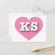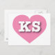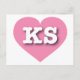Esta postal tiene un vibrante corazón rosado que contiene las letras negrita, blanca y alta del KS, la abreviatura oficial de Kansas, el estado de los girasoles. El lado inverso de la postal está en blanco, a la espera de tus sentimientos escritos a mano o de tu texto personalizado.