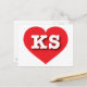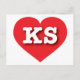 Esta postal tiene un vibrante corazón rojo que contiene las letras negrita, blanca y alta del KS, la abreviatura oficial de Kansas, el estado de los girasoles. El lado inverso de la postal está en blanco, a la espera de tus sentimientos escritos a mano o de tu texto personalizado.