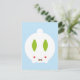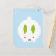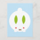 Una toma kawaii sobre el tradicional conejo de nieve japonés con orejas de hojas, ojos de berry y una boca tierna en un fondo azul invernal.