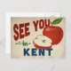 Una encantadora postal de viaje vintage de Kent Washington con una hermosa manzana roja, junto con un divertido texto de estilo retro que dice, "Nos vemos en Kent"