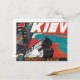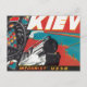 Anuncio de época para viajar a Kiev cuando era parte de la URSS. Rojo y verde azulado con motor de vapor