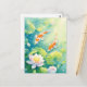 This serene and artistic design features two graceful orange and white koi fish shown swimming through a tranquil, sun-drenched water garden. The koi fish are captured in a gentle, swirling motion, their vibrant orange patterns standing out beautifully against the clear, light turquoise and teal depths of the pond. Surrounding the fish are large, vibrant green lily pads and delicate pink lotus blossoms with yellow centers that float elegantly on the water's surface. Beams of bright golden sunlight filter down from the top right, illuminating the scene with a magical glow and creating shimmering light bubbles that dance in the water. The overall aesthetic is clean, bright, and filled with natural harmony, making it an exceptional choice for nature lovers and fans of Zen-inspired aquatic art. This peaceful koi fish postcard is an ideal choice for sending a soothing "thinking of you" message or a quiet note of gratitude to a friend who appreciates the balance and beauty of a tropical water garden. You might choose to use this artistic card for a botanical-themed birthday invitation or as a lovely way to share a message of peace and prosperity with your family during a housewarming. It also makes a beautiful piece of mini-art for a workspace or a calming addition to a creative journal as a small token of aquatic elegance. This versatile design is also an excellent choice for a retirement message, a graduation thank you note, or as a heartwarming way to share a message of joy for any situation or event.