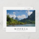 Postal de la foto de la bahía del cocinero tropical con un fondo del barco y del volcán con las palmeras y de la selva en la isla de Moorea, cerca de Tahití en el archipiélago pacífico Polinesia francesa con adentro una caja blanca el texto: "Moorea, Polinesia francesa".