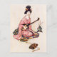 Ilustracion vintage de "The Beautiful Dancer of Yedo" de "Green Willow and other Japanese Fairy Tales" de Grace James. Ella está vestida con un kimono con estampado rosado, y se está arrodillando y tocando un instrumento musical, el shamisen, con un bachi. Ilustracion de Warwick Goble.