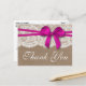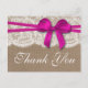 La rústica colección de arcos rosados es un impresionante diseño con un bonito efecto rústico de burrega con un romántico efecto de encaje blanco vintage, con una impresionante cinta rosa oscura con arco. Estas postales pueden ser personalizadas para su ocasión especial y harían la tarjeta de agradecimiento perfecta para cualquier boda, ducha de novia, fiesta de compromiso, fiesta de cumpleaños y mucho, mucho más. *Tenga en cuenta que Zazzle sólo vende postales impresas, por lo que estas postales de agradecimiento no tienen ningún material real de malla, encaje o cinta.