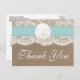 La colección de bodas en la playa, de arena turquesa y dólares, es un magnífico diseño con un bonito efecto rústico en el fondo de la burpón, con un romántico efecto de encaje blanco vintage, con un impresionante dólar de arena y una cinta turquesa. Estas tarjetas postales de agradecimiento pueden ser personalizadas para su ocasión especial y harían el perfecto agradecimiento por cualquier boda en la playa, ducha de novia, fiesta de compromiso, fiesta de cumpleaños y mucho, mucho más. *Tenga en cuenta que Zazzle sólo vende postales impresas, por lo que estas postales de agradecimiento no tienen ningún material real de mallas, encajes, dólares de arena o cinta.