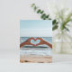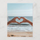 Dos manos se unen para formar un corazón frente a una playa tranquila que simboliza el amor, la conexión y la tranquilidad junto al mar