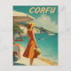 Este elegante afiche vintage capta el soleado encanto de Corfú con una elegante mujer de los años 50 parada en la playa. Vestida con un clásico vestido de verano y contemplando el brillante mar Jónico, encarna el glamour eterno de las vacaciones mediterráneas de mediados de siglo. Con suaves colores retro y texturas nostálgicas, esta obra de arte es perfecta para los amantes de los viajes y de la decoración de la playa.
