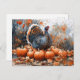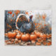 Una pintura acuarela de un pavo de pie orgullosamente entre calabazas y hojas caídas de otoño.