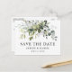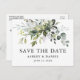 Moderna y elegante acuarela Invitación de compromiso Boda de la vegetación botánica Save The Date Postcard incluye hojas de eucalipto, follaje botánico verde, hojas azul polvorientas y otros hermosos paisajes botánicos.