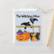 Deliciosa escena de Halloween con gato negro, escoba de bruja. calabazas, araña de cuerdas y vampiros en camisetas y regalos.