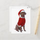El ilustracion festivo es una representación de un perro Labrador de chocolate usando un gorra y chaleco Navidades.