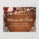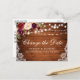 Moderna y elegante acuarela Borgoña Marsala Cambio floral La postal del Boda de la fecha presenta rosas de Borgoña, rosas rosas rosas y vegetación en madera rústica con luces de cuerda y encaje.