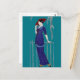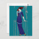 Una mujer elegante de estilo vintage inspirada en la era de la moda Art Deco de los años 20. Esta dama de moda lleva un vestido azul y el gorra rojo tiene un fondo de color verde azulado personalizable.