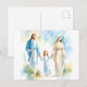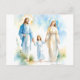 Un retrato delicado de la Sagrada Familia, con Santa María, el Niño Jesús y San José. Unidos por la mano, caminan juntos hacia nosotros para llevarnos de la mano y caminar con ellos en Paz, Esperanza y Fe. Gráfico computacional con pintura, efecto acuarela.