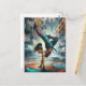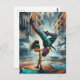 El diseño muestra una escena animada en la que una bailarina de rotura actúa en pleno movimiento en la calle. El personaje principal, el bailarín de rupturas, está en medio de un poderoso atril.