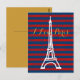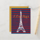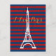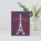 Un ilustracion estilizado de la torre Eiffel sobre fondo de rayas rojas y azules con las palabras 'Amo París'