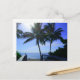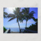 El sol brilla a través de la cima de las palmeras, formando una silueta contra un cielo azul claro. Pasando las barandillas del puente se encuentra la orilla y un océano tranquilo y azul.