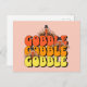 Diseño luminoso y colorido del día de Acción de Gracias con "gobble gobble" en tipografía retro y colores con pavo saliendo del texto.