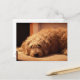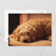 Un labradoodle tendido mirando a la cámara con una expresión triste en su cara.