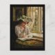 Mujer victoriana con un gorra de moda sentada junto a una ventana leyendo. Mirando a través de la ventana se pueden ver rosas blandas de color rosa. Arte de Thomas Kinnington c1889.