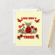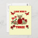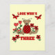 Una mariquita de oso de peluche, flores de corazón rojas y texto que dice "Mira quién es el tres" en un lindo diseño de 3er cumpleaños.