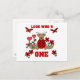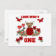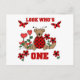 Una mariquita de osito de peluche, flores de corazón rojas y texto que dice "Mira quién es uno" en lindos camisetas de primer cumpleaños, trajes de ropa, tarjetas, pegatinas, botones y más.