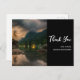 Tarjeta postal de agradecimiento con una hermosa fotografía. Una toma al atardecer con montañas y un lago tranquilo. Luces de cabañas apagadas a lo lejos.
