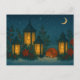 Una acogedora noche de invierno: farolillos brillando en la nieve, un zorro acurrucado por el calor y un holly esparcido bajo un cielo estrellado.