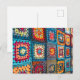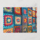 A handmade large crochet blanket composed of many colorful granny squares stitched together to form a vibrant patchwork design. The image highlights traditional yarn craftsmanship, detailed needlework and cozy textile artistry.