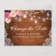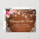 Moderna y elegante acuarela color rosa Rubor Cambio floral La postal de postposición del Boda de fecha cuenta con rosas rosas rosas rosas rosas y vegetación en madera rústica con lámparas de cuerdas de tarro de masón y encaje.