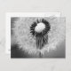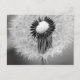 Un cierre encima de la fotografía blanco y negro de las semillas del diente de león. Algunas semillas han arrancado ya, mientras que las semillas restantes crean un círculo en el amortiguador blanco del perno de una cabeza de flor.