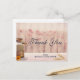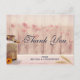 Una tarjeta postal de agradecimiento para bodas o demás. Diseñada con un tema rústico de campo. Una vieja lata de leche oxidada con una hermosa flor amarilla a su lado. Trigo y flores descoloridas rosadas en el fondo sobre un panel de madera tenue.