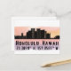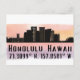 Postcard presenta la silueta de la ciudad honolulu Hawaii con salpicaduras de acuarela y coordenadas del mapa de latitud y longitud