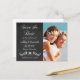 Las imágenes de cartón son siempre populares, y este diseño elegante no es una excepción. Tu fotografía (en blanco y negro o en color) está en el lado derecho, con un guión bonito de plata "Save the Date" a la izquierda. El texto de su personalizado y el emblema de la hoja de laurel con un corazón plateado también están a la izquierda. La parte posterior de la tarjeta tiene un campo de texto adicional si es necesario. Todo el texto, frontal y posterior, es fácilmente personalizado.