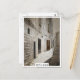 Postales de lavandería con mantas blancas colgadas para secarse al sol en la fachada de una casa de piedra blanca en una callejuela con escaleras de piedra arenisca en una ciudad de Italia, creando una típica vista de la calle italiana/mediterránea. Tiene un borde blanco y el texto 'Toscana'.